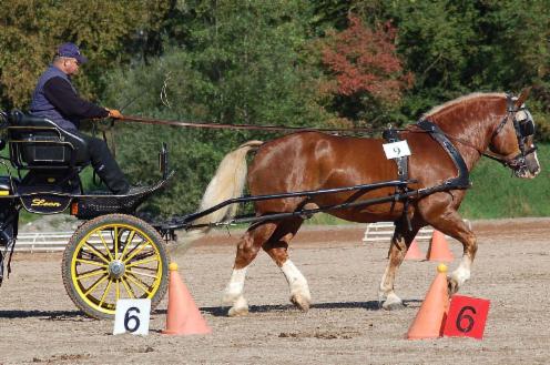 Deckhengst Schogun, geboren 2001 (V: Scharun v. Oberland, MV: Vampir I), bei seiner Leistungsprüfung 2006 in München- Riem, vorgestellt vom Haupt- und Landgestüt Schwaiganger, Fahrer Andreas Mayer (Foto: Isabell Dachs)
