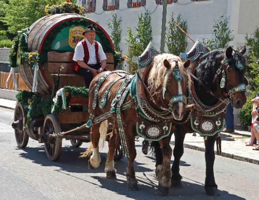 Die Deckhengste Scharun v. Oberland, geboren 1992 (V. Schoenach, MV: Dirnberger) als Handpferd und Vikitus, geboren 1995 (V: Victor, MV: Verden) ziehen beim Bierzelteinzug an Pfingsten 2014 in Bad Kötzting das Fuhrfass. Fuhrmann und damaliger Besitzer der beiden ist