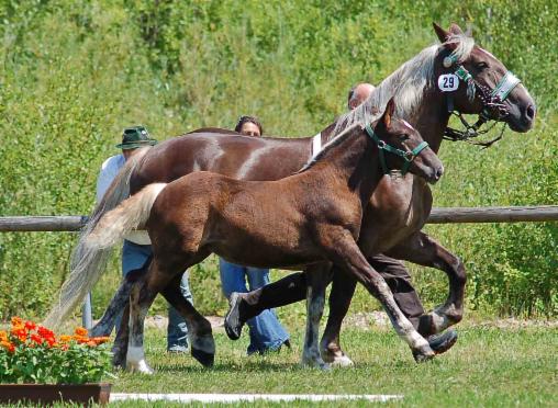 Stute Romina von Johann Zeidler aus Tragenschwandt bei der Verbandsstutenschau 2014 in Bad Kötzting mit einem Fohlen von Salvator I bei Fuß.