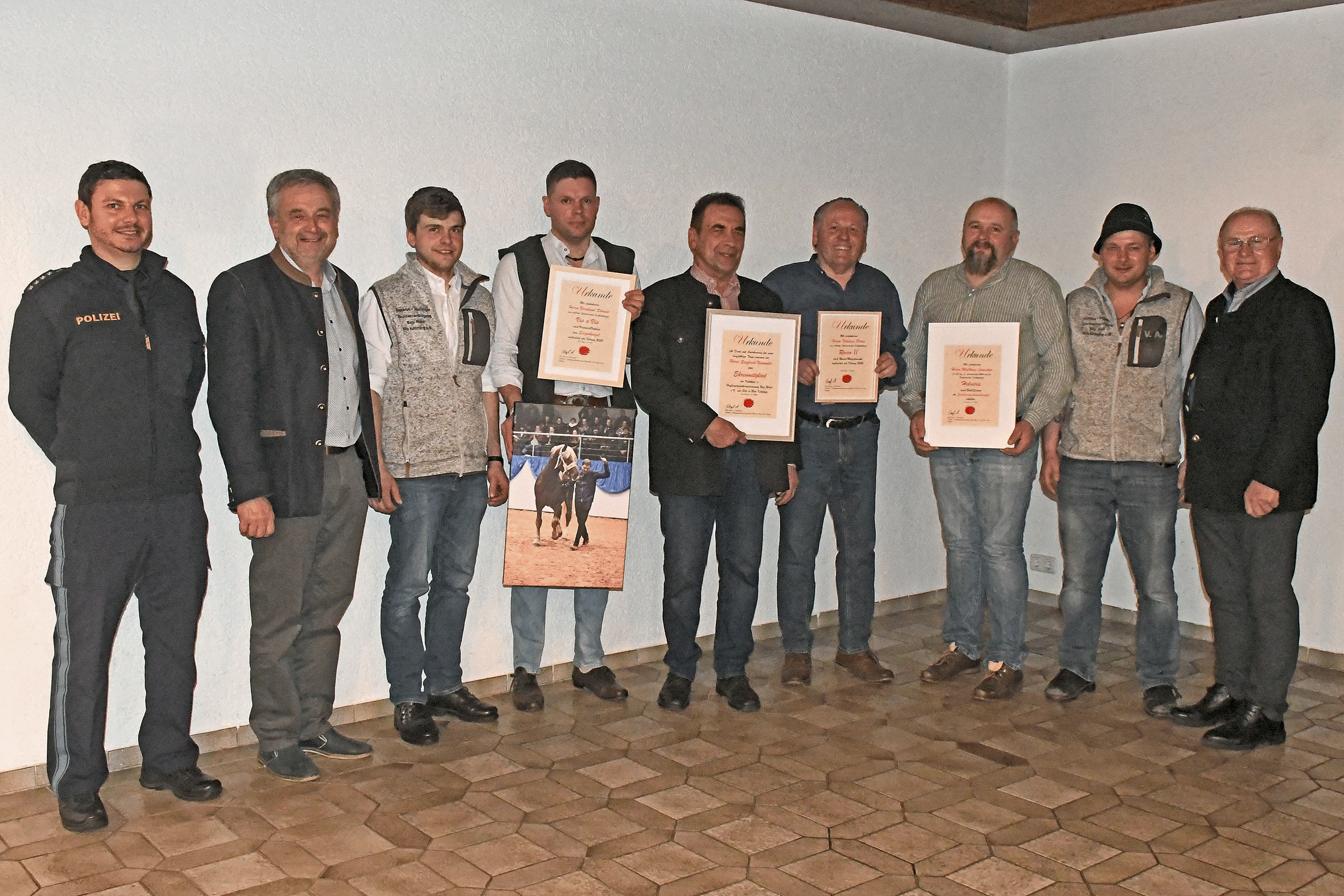 Im Anschluss durfte Berger zusammen mit der Vereinsführung verdiente Züchter ehren, allen voran in diesem Jahr Bernhard Schmid aus Hohenwarth, der im Jahr 2023 auf der Körung in München-Riem den Bewegungssieger beim Süddeutschen Kaltblut stellte. 2024 wurden zwei Hengste von ihm gekört, wobei der Hengst „Vis a Vis“ Körungssieger war. Hubert Berger führte aus, dass Schmid zwar die Hengste nicht selbst gezüchtet, aber beim Ankauf der Tiere großen Sachverstand bewiesen habe, weshalb er vom Verband eine Auszeichnung zum Züchter des Jahres erhielt. Für seinen ebenfalls gekörten Hengst „Rocco II“ wurde Nikolaus Bauer aus Obertaufkirchen ausgezeichnet. Matthias Lamecker aus Meinzing konnte mit seiner selbst gezogenen Stute „Helvicia“ auf der Landesschau eine Staatsprämienanwärterin stellen, weshalb auch er eine Auszeichnung erhielt.