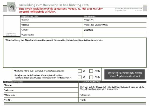 Bitte das Anmeldeformular für jedes vorgestellte Pferd vorab ausfüllen und bis spätestens Freitag, 22. Mai 2026 (12 Uhr) an gerstl-hof@web.de schicken.